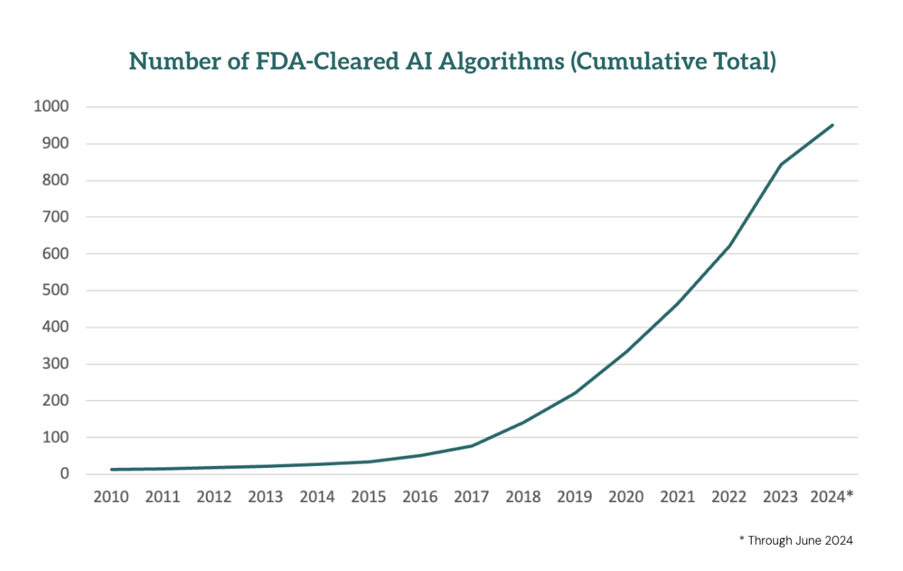 Over the past five years, we’ve witnessed an explosion in FDA-cleared algorithms – over 1,000 are expected to be cleared by the end of 2024.